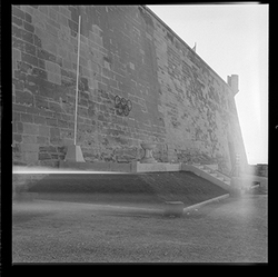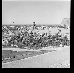 "Vista de la part posterior del Baluard de la Mitja Lluna i part inferior del Baluard del Rei, de les muralles del Turó de la Seu Vella; a la part inferior ex veu el monument als afusellats durant la guerra civil (Monumento a los Caídos )"