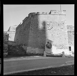 "Vista del Baluard de l‘ Assumpció de les muralles del Turó de la Seu Vella, des de la Plaça de la Sardana"