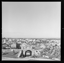"Vista de la part posterior del Baluard de la Porta del Lleó, de les muralles del Turó de la Seu Vella, des de la Plaça de la Sardana; amb els jardins (actualment de Pompeu Fabra); al fons es veu la ciutat i parcialment el Turó de Gardeny"