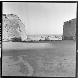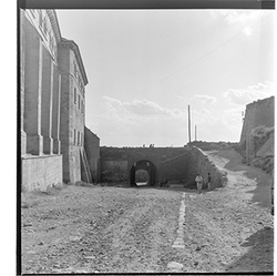 "Vista, des de l’interior, de la part inferior del Baluard de l'Assumpció, de les muralles del Turó de la Seu Vella, amb la porta dels Bernats"