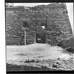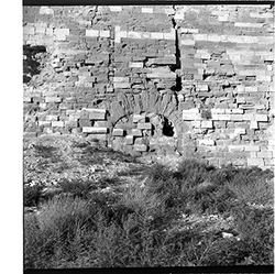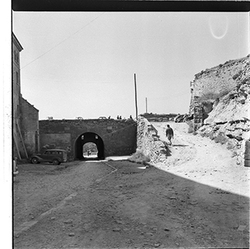 "Vista, des de l’interior, de la part inferior del Baluard de l'Assumpció, de les muralles del Turó de la Seu Vella, amb detall de l'arc de la porta dels Bernats"