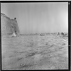 "Vista de l'espai al davant de la part inferior del Baluard de l'Assumpció, de les muralles del Turó de la Seu Vella; al fons es veu el Castell de la Suda"