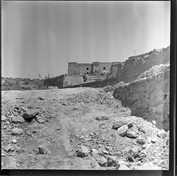 "Vista de l’espai de les muralles del Turó de la Seu Vella, al davant de l'edifici de l'antiga Casa d'Exercicis de la Seu Vella (Canònica); a la dreta, es veu al pujada al Baluard de l'Assumpció, de les muralles del Turó de la Seu Vella i a la Suda; al fons hi ha la porta del Revellí"