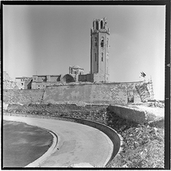 "Vista, des de la Llengua de Serp, de la pujada a la Seu Vella, amb els jardins de Pompeu Fabra (actuals), en primer terme; al fons hi ha el Baluard de l'Assumpció de les muralles del Turó de la Seu Vella, la Porta dels Apòstols i el campanar"