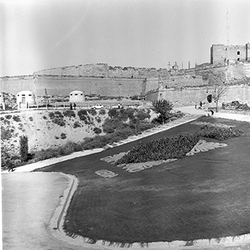 "Vista dels jardins de pujada a la Seu Vella, des de la muralla de la Llengua de Serp; s’hi veu l'escut Lleida Terraferma , format per plantes i flors; al fons hi ha el Baluard del Rei de les muralles, i el Castell de la Suda; a l’esquerra es veuen els dipòsits d’aigua"