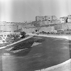 "Vista del Baluard del Rei, el pont llevadís i el Baluard de la Mitja Lluna de les muralles del Turó de la Seu Vella, amb el Castell de la Suda des de la Plaça de la Sardana"