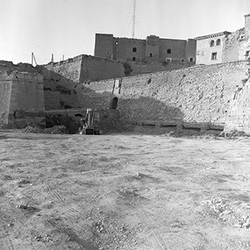 "Vista exterior de la Seu Vella des del Baluard del Rei; en primer terme es veu la porta d’accés al recinte de la Suda; al fons a la dreta, es veu l’edifici de l'antiga Casa d'Exercicis de la Seu Vella (Canònica)"