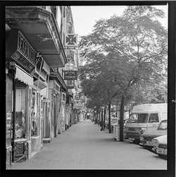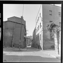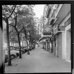 "Vista del Carrer Canonge González, des del xamfrà amb el Carrer Germanetes dels Pobres, on hi havia la Casa Macià i/o Agapito Lamarca on hi havia hagut la Clínica Montserrat; al fons hi ha l'Avinguda de Catalunya"