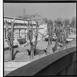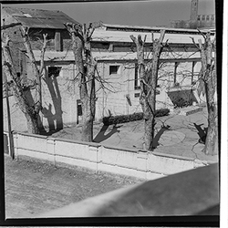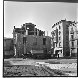 "Avinguda de Madrid; obres d’urbanització; edifici de l’antic de la Gota de Llet, Dispensari Municipal i Casa de Socorro, antigament també va fer funcions de laboratori municipal; al fons el Banco de España"