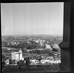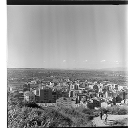 "Vista de la ciutat de Lleida des de les muralles del Turó de la Seu Vella, en direcció nord, s’aprecien com a elements destacats: l'edifici del Ambulatorio de la Seguridad Social al Carrer Salmeron, l'Avinguda de Prat de la Riba, i el barri del Secà de Sant Pere al fons"
