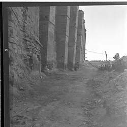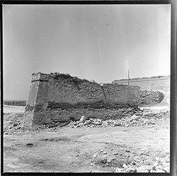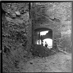 "Vista del Baluard de l'Assumpció, de les muralles del Turó de la Seu Vella, des de l’interior, amb el procés de neteja de la porta dels Bernats, la qual dóna sortida a la Plaça de la Sardana"