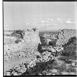 "Vista de l'accés a la Plaça de la Sardana, des del Baluard de la Falsa Braga de les muralles del Turó de la Seu Vella; al fons es veu la ciutat de Lleida"