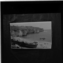 "Reproducció; paisatge de costa, platja i barca"
