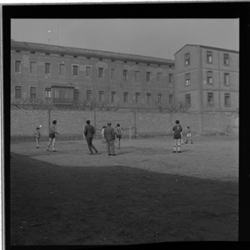 "Vista parcial del pati i l’edifici de la Maternitat de la Diputació de Lleida; diversos nens juguen a futbol"