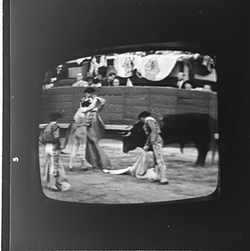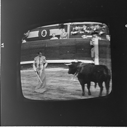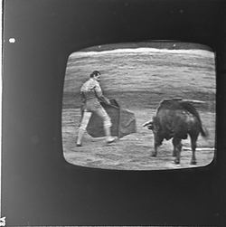 "Reproducció d’imatges de la televisió on es veu una cursa de braus"