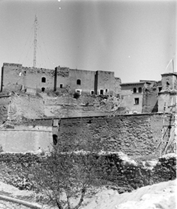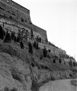 "Vista del campanar de la Seu Vella, des del camí de ronda del Canyeret, amb el Baluard de la Falsa Braga en primer terme"