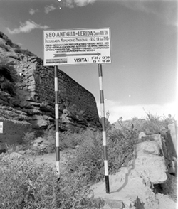 "Rètol amb els horaris de visita a la Seu Vella, al davant de la Porta de Sant Berenguer, al camí de pujada a la Suda"