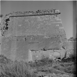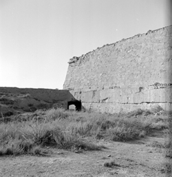 "Detall de la coneguda Porta del Sas, a la part inferior del Baluard del Rei de les muralles de la Seu Vella, la qual apareix amb obres d’obertura, grans carreus de pedra "