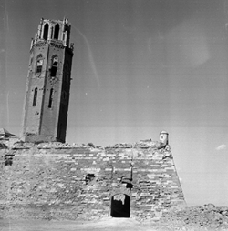 "Vista de la porta de San Andreu que dóna accés al Baluard de la Falsa Braga de les muralles de la Seu Vella, amb el campanar al fons; a l'ombra de l'arc està assegut Lluís Terrés Pàmpols Pàmpols (foto del seu fill Lluís Terrés Pàmpols Saltó)"