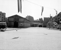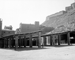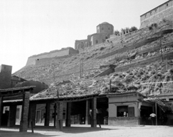 "Porxos i edifici de l’antic mercat de la Magdalena, des de Plaça Mossèn Jacint Verdaguer; a la dreta es veu l’antiga Muralla de la Magdalena i el Turó de la Seu Vella; unes banderes espanyoles indiquen un ambient de festa major; a l’esquerra, hi ha un carro"