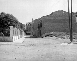 "Porxos de l’antic mercat de la Magdalena, des del Carrer Pi i Margall (antic Calvo Sotelo); al fons es veu l’antiga Muralla de la Magdalena i el Turó de la Seu Vella.\nBar Peret. Teléfono público. Tèlefon públic"