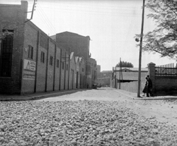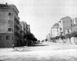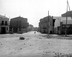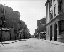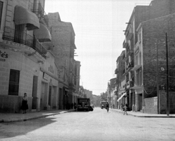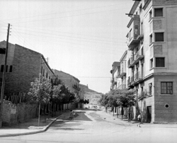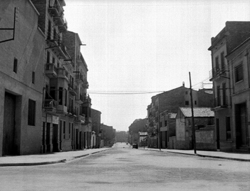 "Carrer Pi i Margall (Calvo Sotelo) des la Plaça del Treball; a la dreta, l’edifici de l'Escola del Treball i el xamfrà amb el Carrer Alfred Perenya"