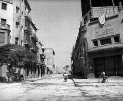 "Carrer Pi i Margall, xamfrà amb l ‘Avinguda Prat de la Riba; a la dreta es veu parcialment l’edifici del Frontón de Lérida , al davant del qual hi ha un home amb bicicleta"