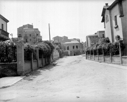 "Grup d’habitatges unifamiliars que en l’època es conegué amb el nom de Las casas Baratas ; Carrer Alfred Perenya, vist des del Carrer Enric Granados; lloc conegut actualment com la Plaça Social"