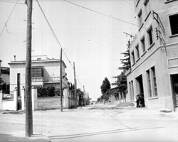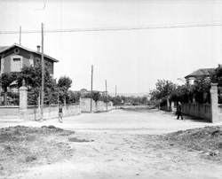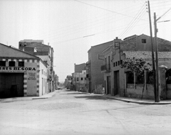 "Grup d’habitatges unifamiliars que en l’època es conegué amb el nom de Las casas Baratas ; Carrer Alfred Perenya, vist des de l’Avinguda Alcalde Porqueres, antiga carretera nacional núm. 230"