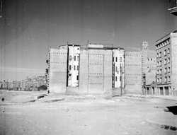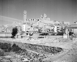 "Avinguda del Segre; obres de canalització i cobriment del riu Noguerola, en primer terme; al fons el Turó de la Seu Vella, amb el Claustre i el Campanar"