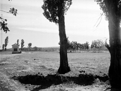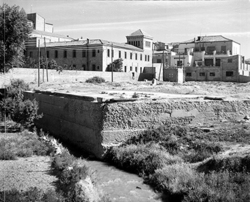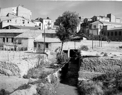 "Avinguda del Segre; lloc que és actualment la Plaça de Pere Sanahuja, sobre el riu Noguerola, en primer terme; al fons l’edifici dels Franciscans, entre els carrers Alcalde Fuster, Vila Antònia i Maria Sauret"