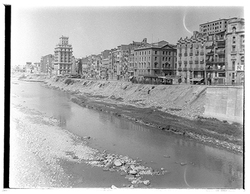 "Vista del Riu Segre des del Pont Vell. A l’Avinguda de Blondel, el nou mur en construcció, i al fons l’edifici de la Caja de Ahorros y Monte de Piedad, o Montepio "