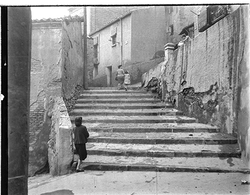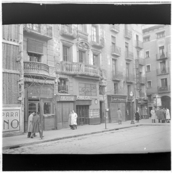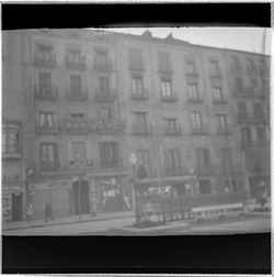 "Des del començament de la Plaça de Sant Joan, vista de la Casa Murillo i dels Porxos De Baix , al fons; a l'esquerra, en primer terme, es veuen les obres de construcció de l'edifici del BANCO ZARAGOZANO"