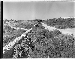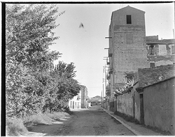 "Edificis de l’actual Avinguda de València, al barri de Cappont, abans de la seva urbanització; a l’esquerra la Sèquia de Torres"