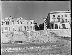 "Construcció del mur de contenció per ampliar l’Avinguda de Madrid; vista des del marge esquerre del riu; al fons el Montepio al altres edificis"