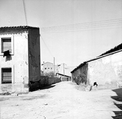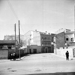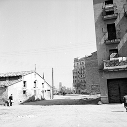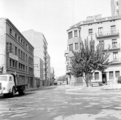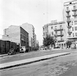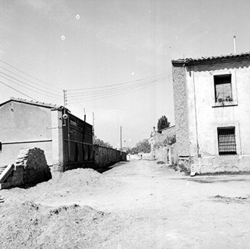 "Carrer de les Torres de Sanuí, des del Carrer Balmes; a l’esquerra es veu la tanca de l’antic Asilo Borràs, posteriorment Jardins de Pau Casals"