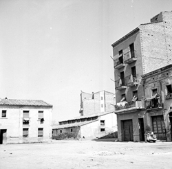"Carrer Bisbe Martín Ruano; a la dreta, el xamfrà amb el Carrer de les Torres de Sanuí; al fons, la Plaça Ricard Viñes (Vinyes) i el monòlit conegut com la Cruz de los Caídos"