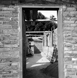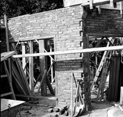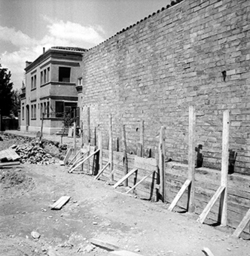 "Eduardo Velasco; construcció dels nous tallers, als carrers de Santa Cecília, Eduardo Velasco i Avinguda d'Alacant; aixecament de murs; vista exterior, des del Carrer de Santa Cecília"