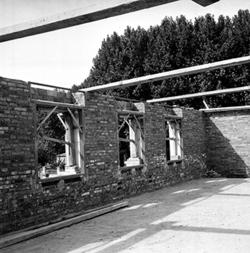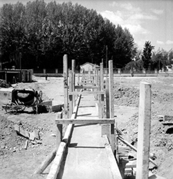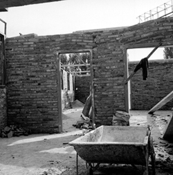 "Eduardo Velasco; construcció dels nous tallers, als carrers de Santa Cecília, Eduardo Velasco i Avinguda d'Alacant; aixecament de murs; vista interior; al fons els Camps Elisis"