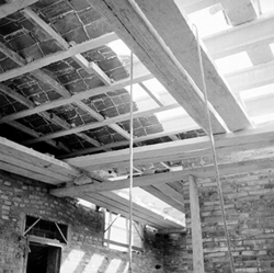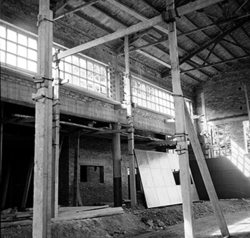 "Eduardo Velasco; construcció dels nous tallers, als carrers de Santa Cecília, Eduardo Velasco i Avinguda d'Alacant; aixecament de murs i teulades; vista interior"