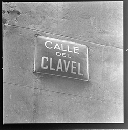 "Detall d’una placa amb el nom del carrer: Calle del Clavel , o Carrer Clavell"