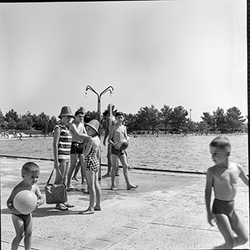 "Parque municipal Alcalde Pons , Les Basses; piscines amb banyistes; uns nens juguen amb les dutxes"