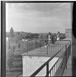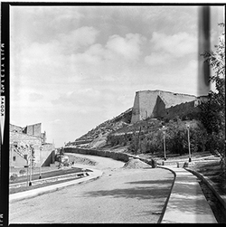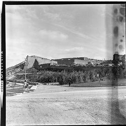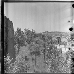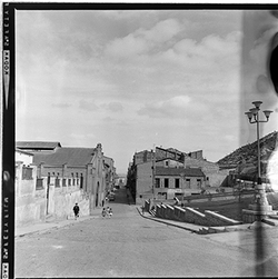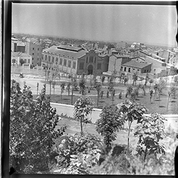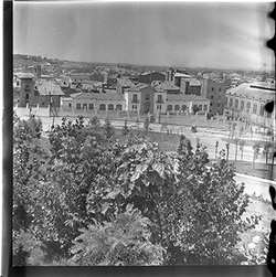 "Vista de la ciutat de Lleida des de la Llengua de Serp, de les muralles del Turó de la Seu Vella, en direcció nord-oest, s’aprecien com a elements destacats: el Carrer de Sant Martí amb l'edifici de la Junta Provincial de Protección de Menores; Mediopensionado Santo Ángel de la Guarda "