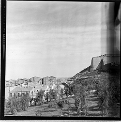 "Jardins d’accés a la Seu Vella; al fons la muralla de la Punta del Diamant"