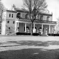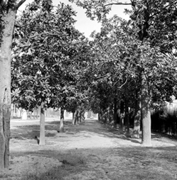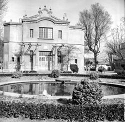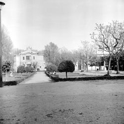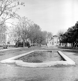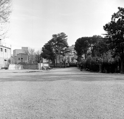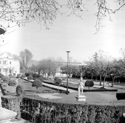 "Camps Elisis; jardins; al fons es veu el solar annex al l’edifici de l’antic teatre, Pavellón Frutero de la Fira de Sant Miquel i actual Pavelló Poliesportiu Antorxa, on es construirà la piscina coberta"