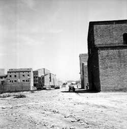 "Part del darrera de les cases que donen a l'Avinguda de Sant Ruf; al fons es veu el pont sobre el ferrocarril, el qual seria l’inici de l’actual Avinguda Alcalde Recasens; en primer terme, una font pública"