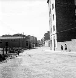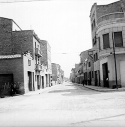 "Carrer Alfred Perenya, des del xamfrà amb el Carrer Pallars; al fons la Plaça del Treball i el Carrer Príncep de Viana"