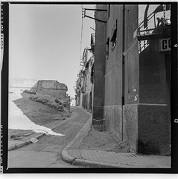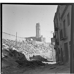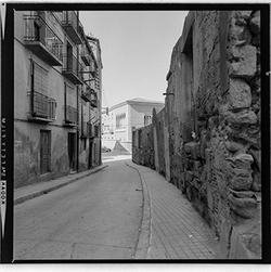 "Carrer de la Tallada; a la dreta les ruïnes del Palau dels marquesos de la Tallada, antic Palau Episcopal; l’actual al fons"