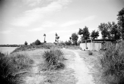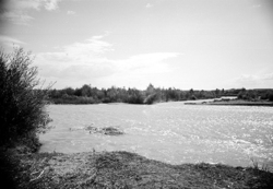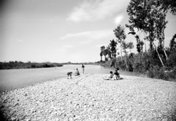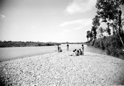 "Barri de Pardinyes; zona d’esbarjo i pícnic de la Mitjana; diverses persones es banyen al riu Segre; lloc conegut antigament com El Recorrido ; al fons es distingeix el perfil del castell d’Alcoletge"