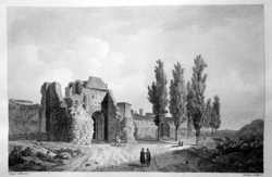 "Dibuix antic de la ciutat de Lleida amb la representació de la Porta de Boters, a les muralles"